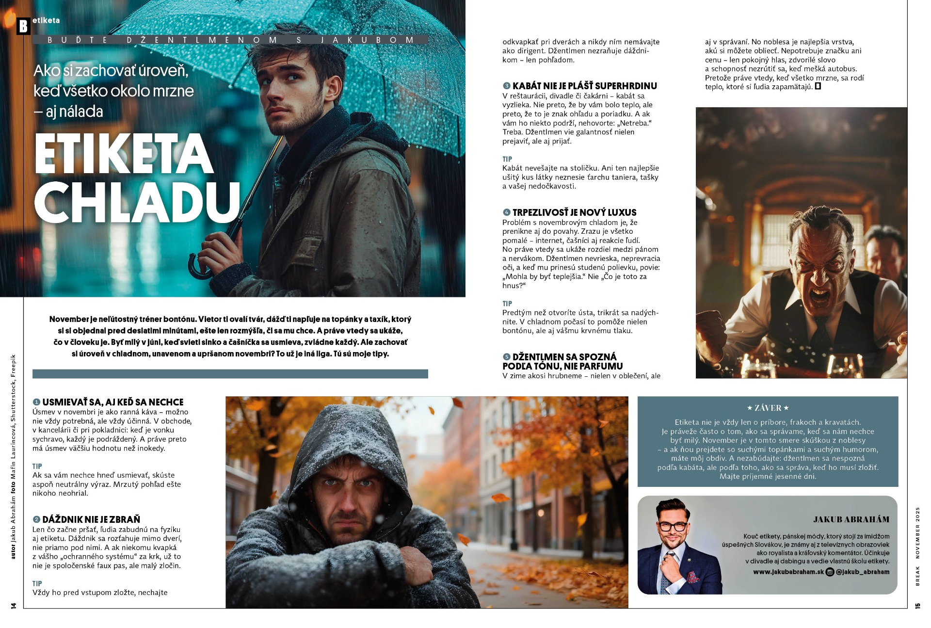 Novembrové počasie je skúškou charakteru. Keď fúka ostrý vietor a topánky máte premočené od dažďa, zachovať si úroveň a dobrú náladu je skutočné umenie. Vo svojom článku pre časopis BREAK vám prinášam praktické rady, ako zvládnuť sychravé obdobie s gráciou.